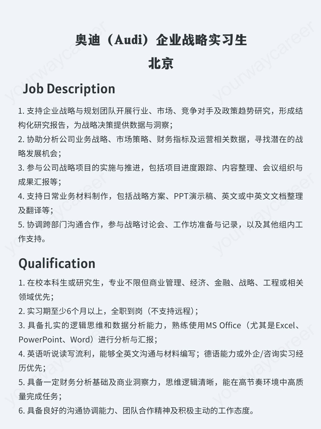 Brief History: 奥迪成立于1909年,由奥古斯特·霍希创立,总部位于德国英戈尔施塔特。1960年代并入大众集团,成为其高端品牌。1980年代推出quattro四驱系统,奠定高性能形象。2010年代起加速电动化转型,2023年宣布逐步停止内燃机研发,计划2033年前全面停售燃油车。