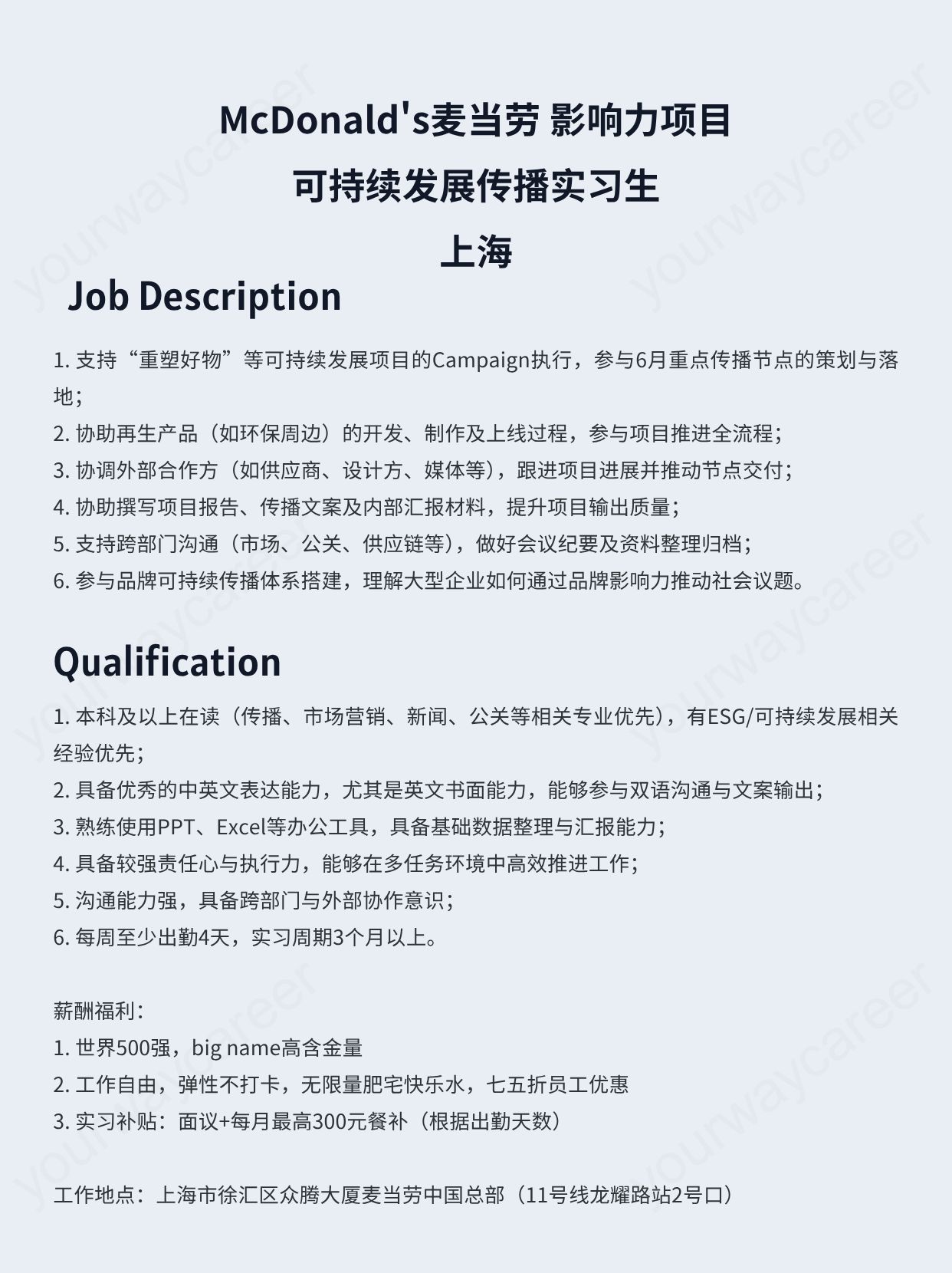 上海|McDonald's麦当劳 影响力项目 可持续发展传播实习生